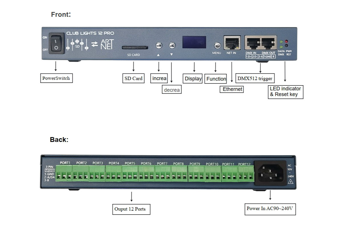GC-6612Pro ist ein Standalone Pixel-LED-Controller mit 12 Ports Anschlüssen. Er unterstützt DMX512- und SPI-LED wie TM1812, WS2811,