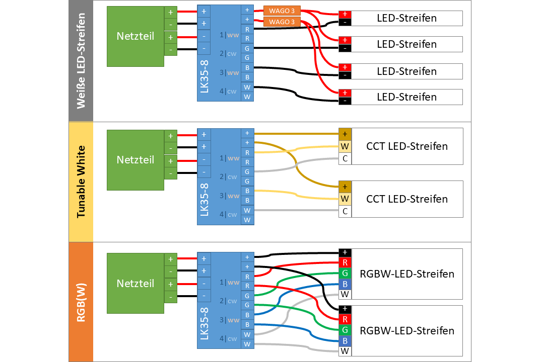 Anschluss: Eingang: V+/Masse; Ausgang: Ch.1-4 (R,G,B,W) ,V+