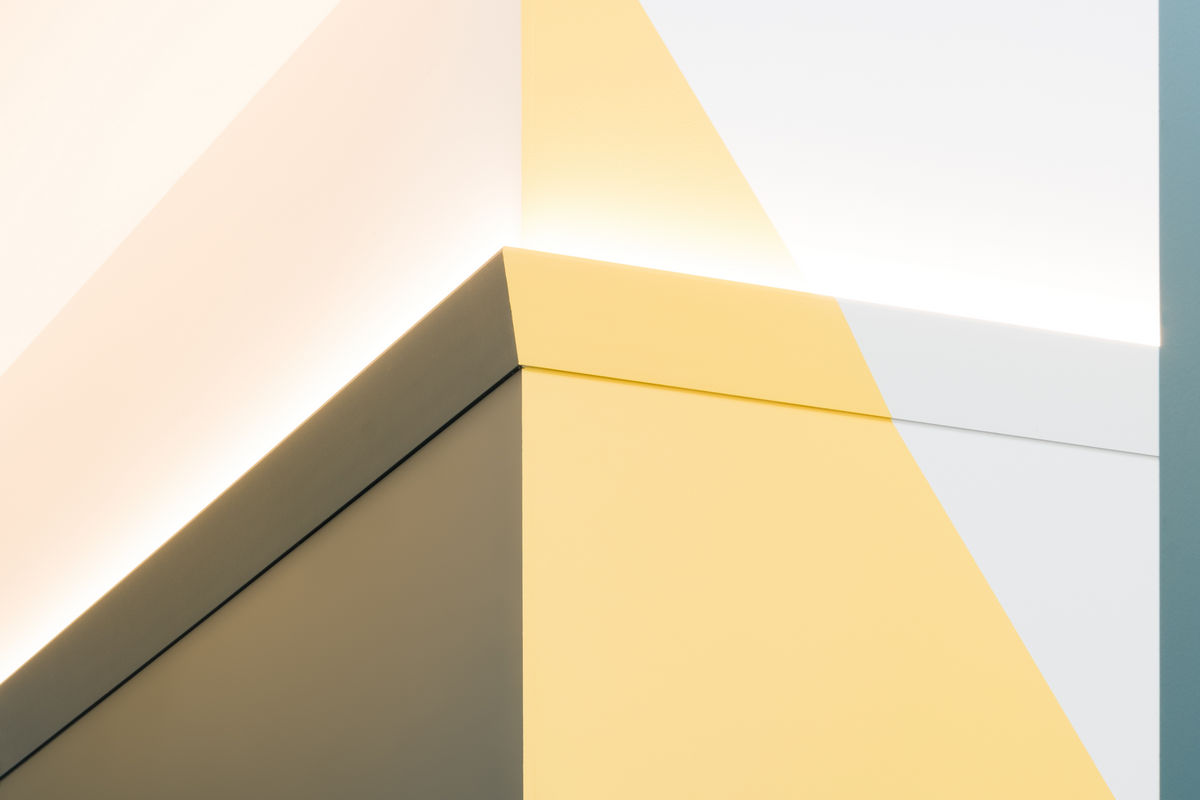 Die LED-Bänder sollten für eine optimale Wärmeableitung und eine lange Lebensdauer niemals direkt in die Vouten geklebt, sondern mit Aluprofilen, wie unserem PL1 in den Vouten verbaut werden. D.h. zuerst wird das Aluprofil in die Voute gelegt und in dieses wird dann das LED-Band geklebt. Da die Vouten selbst nicht 100% lichtdicht sind, sorgen die Aluprofile zudem für eine saubere Lichtführung.