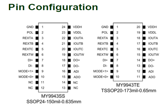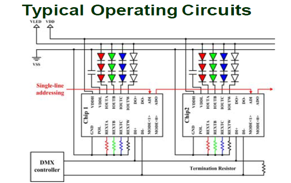 Beim MY9943 handelt es sich um einen kaskadierbaren 4-Kanal Konstantstrom LED-Treiber mit DMX-Protokoll und differentiellen Interface. Dieser Typ wird per single line addressing angesteuert. In Kombination mit dem MY9942, mit dem die erste DMX-Adresse per DIP-Schalter eingestellt wird, können diese Typen in der Kette automatisch adressiert werden.