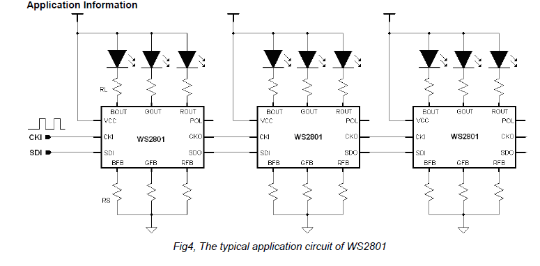 Beim WS2801 handelt es sich um einen speziellen IC, der für LED-Pixel-Anwendungen entwickelt wurde. Der Chip beinhaltet 3 Konstantstrom-Ausgänge für eine RGB-LED bis max. 50mA sowie Data- und Clock-Leitungen für die Kommunikation mit einem Controller. Es wird ein serielles Datenprotokoll verwendet, das z.B. auch von AVRs in eigenen Applikationen erzeugt werden kann. Es ist aber auch kompatibel mit dem hier im Shop erhältlichen Controller für digitale Stripes.