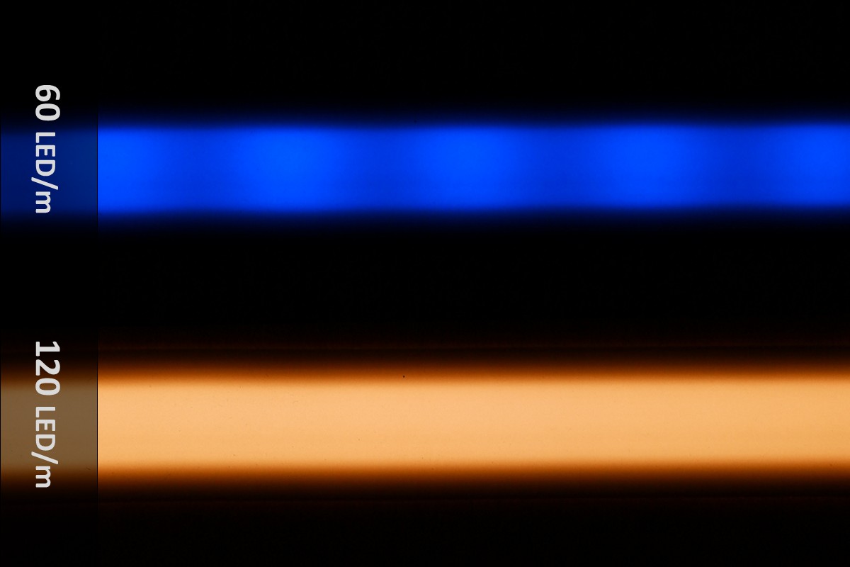 The flexible silicone means that curves are also possible and the opal structure of the cover effectively blends LED points (from 120 LEDs/m). The result is a uniform, homogeneous line of light.
