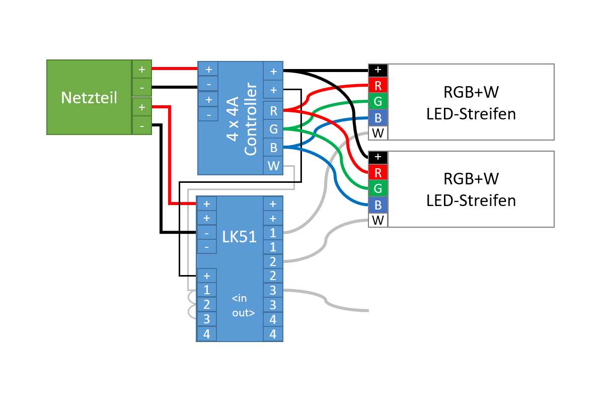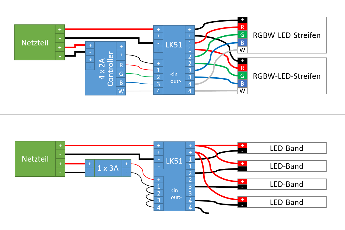 Note: We do not recommend running LED strips in parallel on controllers AND repeaters, as this may result in brightness and/or color deviations. The basic rule is: Either connect everything to controllers or everything to repeaters.