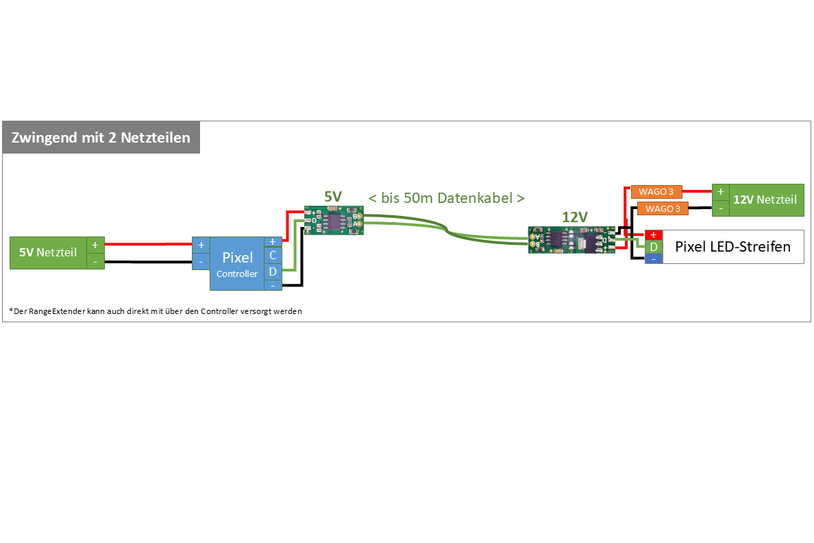 This range extender eliminates this problem by converting to a symmetrical signal (similar to DMX-signales). Instead of sending the signal on one line, it is transmitted on two lines. One line carries the normal signal, the other is inverted. The relevant information can be read by the difference between the two lines. Since disturbances always influence both lines equally, the information can still be read by the difference between the two lines. At the end of the cable the signal is converted back to the normal format for digital LED-stripes.