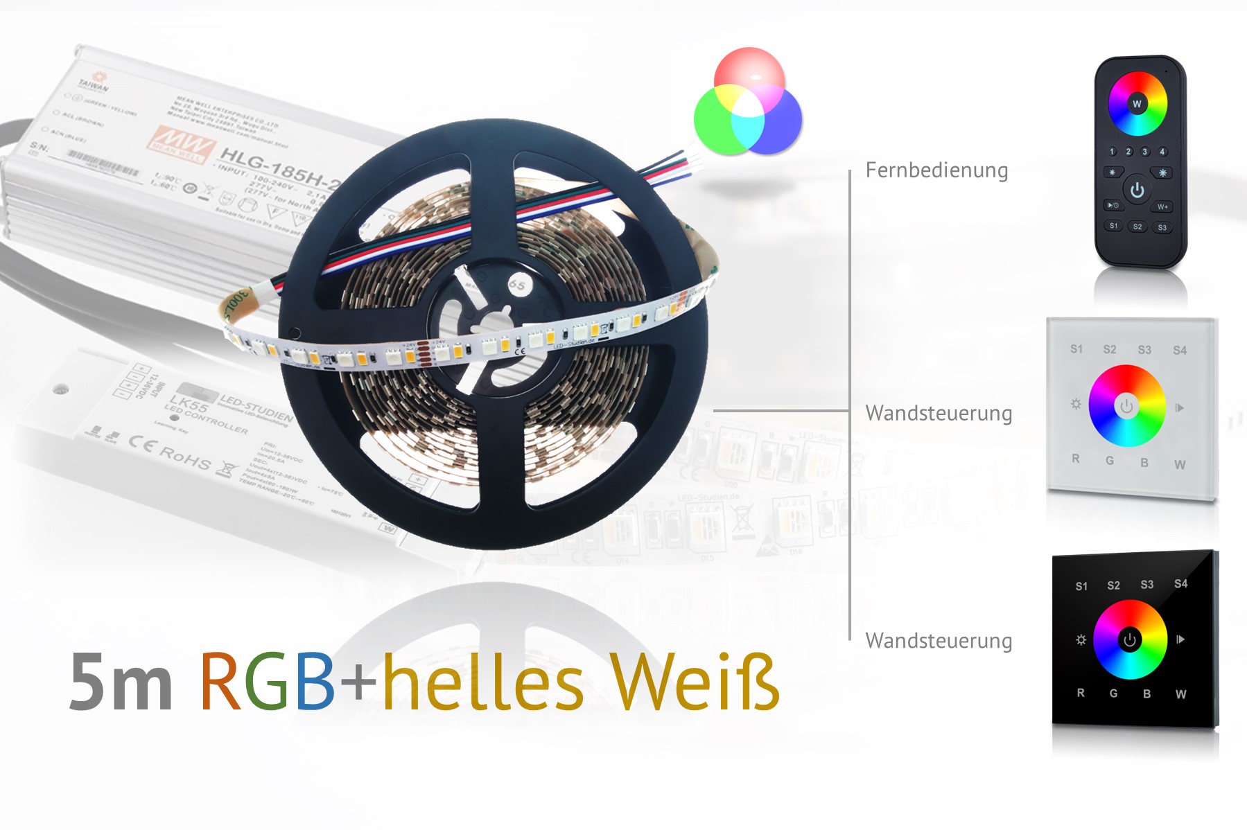 The set consists of a 5m roll of special RGB+WW tape for bright room main lighting + colour effects.