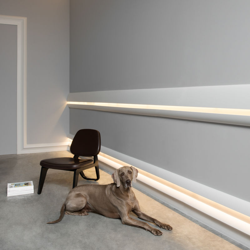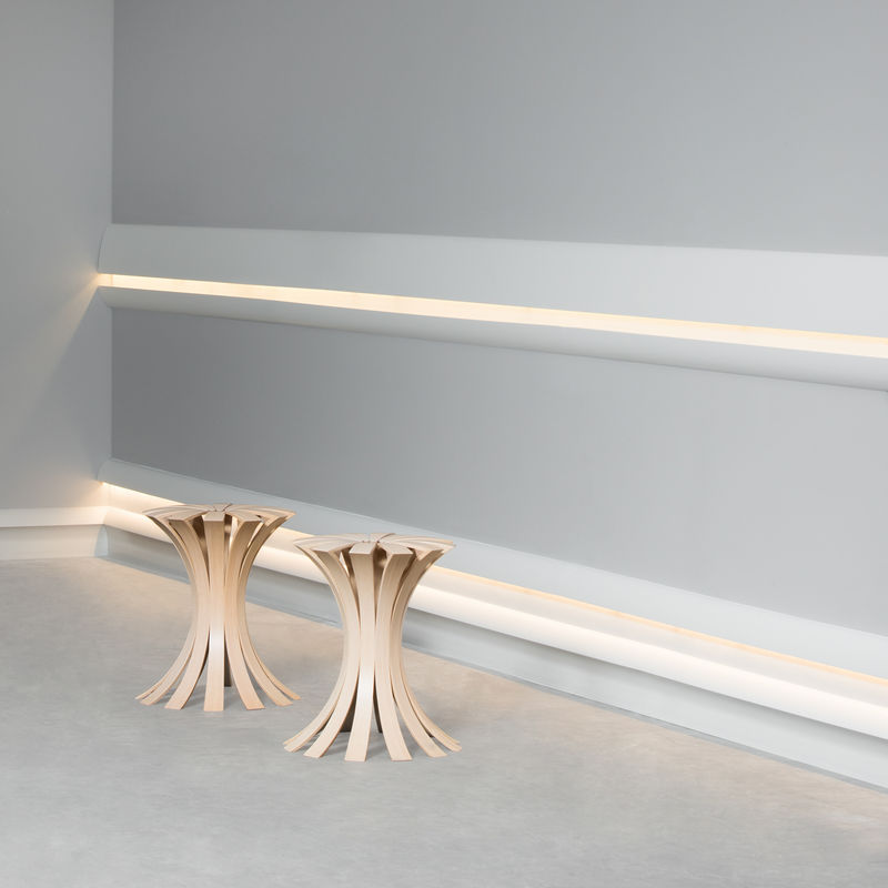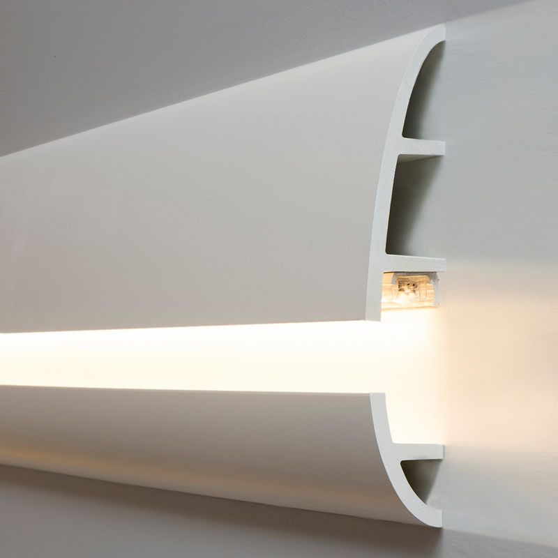 The LED strips should never be glued directly into the coving for optimal heat dissipation and long life, but should be installed in the coving with aluminum profiles, such as our PL1. I.e. first the aluminum profile is placed in the cove and then the LED tape is glued into it. Since the cove itself is not 100% light-tight, the aluminum profiles also provide a clean light guide.