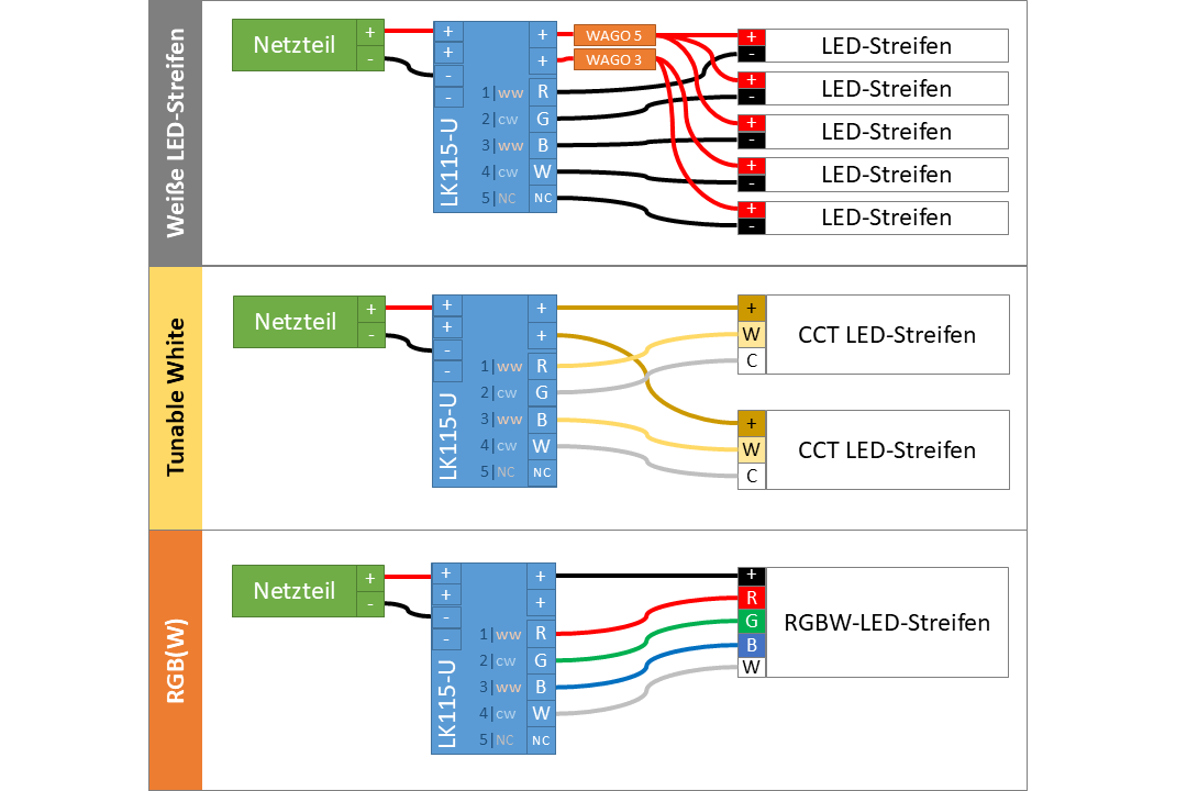 The LK115 series works with the ZigBee 3.0 standard. This makes it compatible with established systems such as Philips HUE or Ikea TRADFRI. LED strips with 12V or 24V can be connected to the driver. Also LED spots, LED panels and other components with this function and constant voltage can be operated.