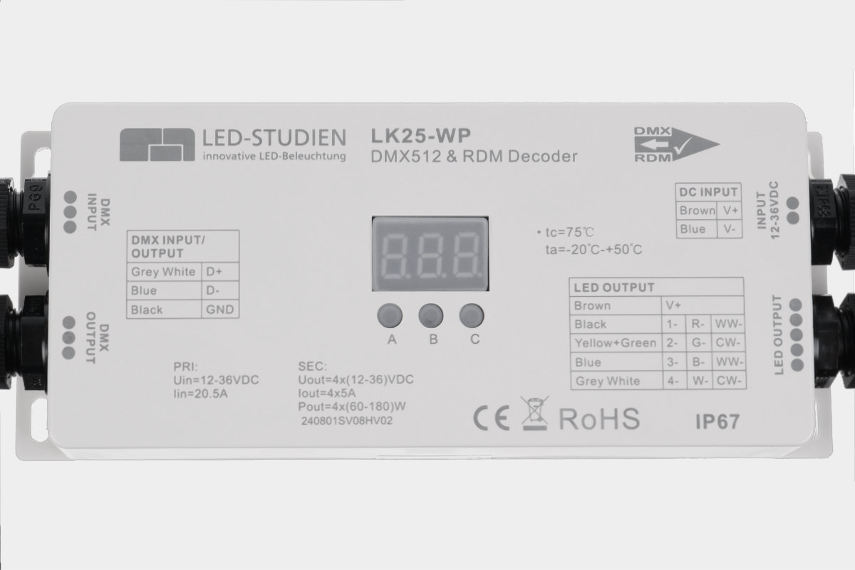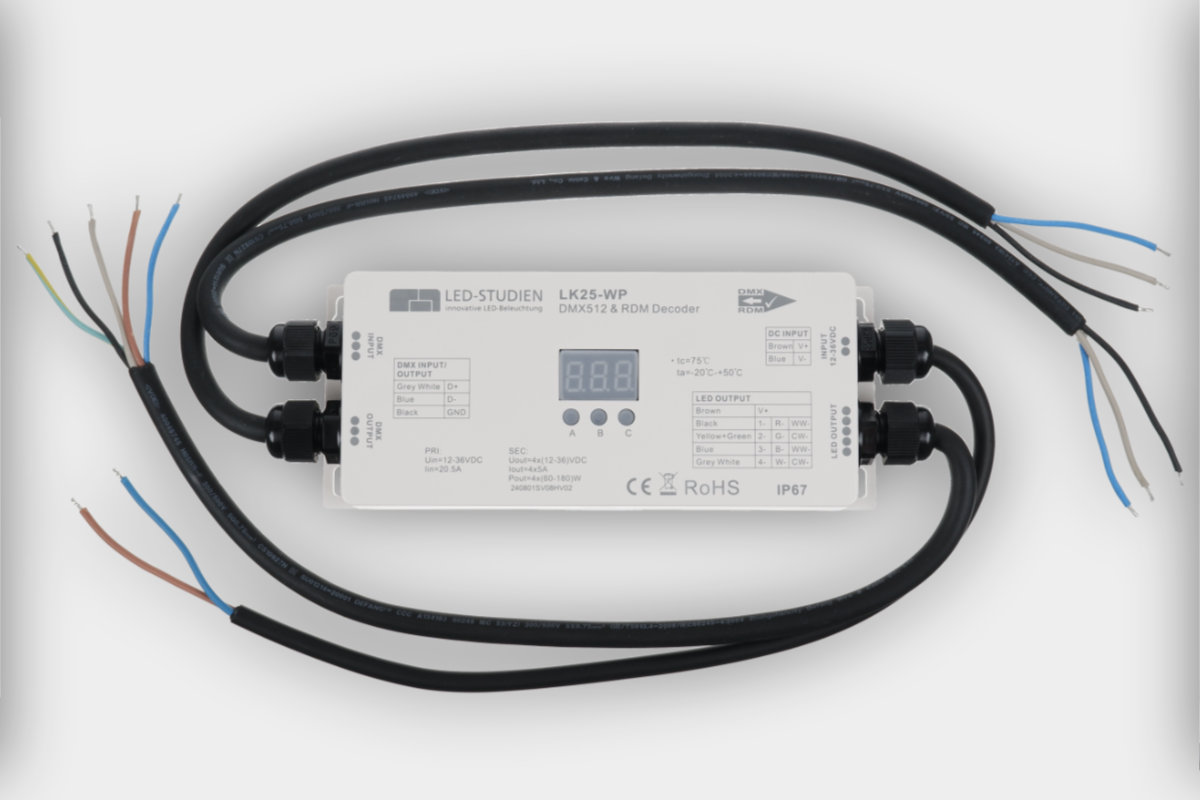 This waterprotected (IP67) decoder is connected to the DMX bus and occupies 1-4 DMX addresses to control the 4 outputs. Each output channel can be loaded with up to 4A. The voltage range of 12-36V makes it very flexible to use. The DMX start address is adjustable. Further functions (like 8 or 16Bit resolution) can be set by buttons on the display and of course the driver is RDM compatible.