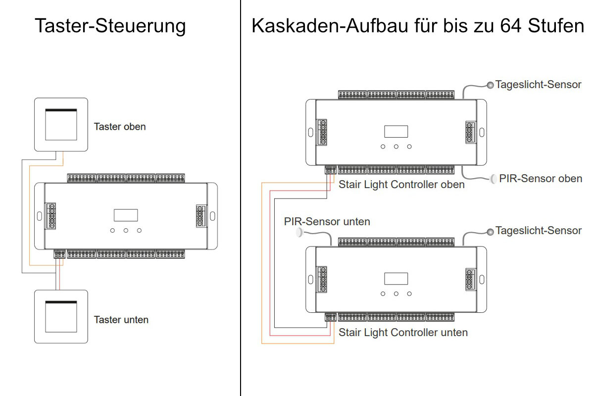 - 2 controllers can be cascaded for large staircases with up to 64 steps