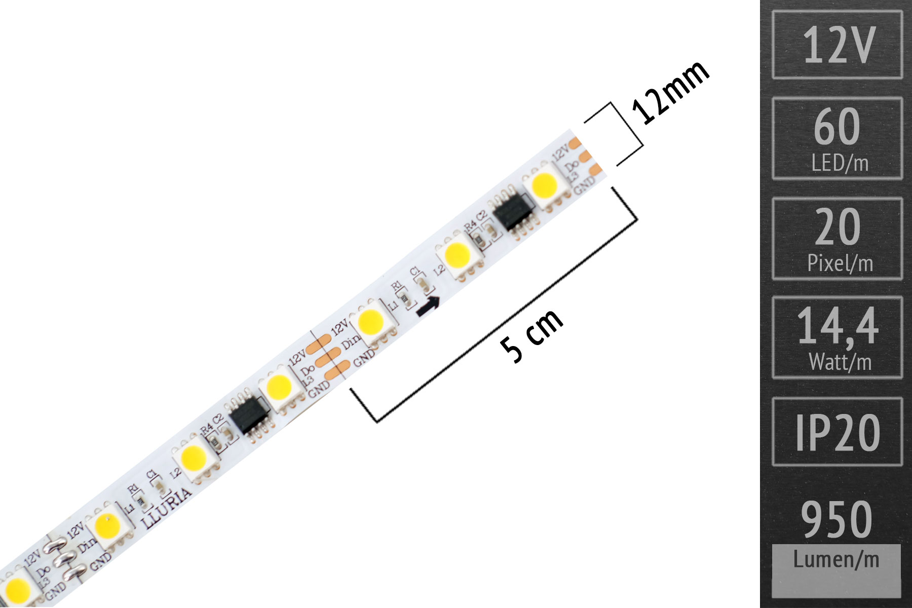 The 12V structure is realized in a way that always 3 LEDs are controlled by one IC. So 3 LEDs always form 1 pixel. The resolution (10 or 20 pixels/m) is of course lower than with 5V pixel strips (30 or 60 pixels/m), but for large installations such a fine resolution is often unnecessary.