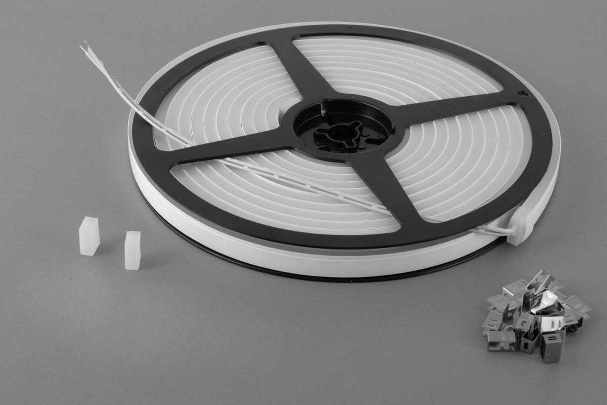Die NEONFLEX Bänder sind absolut gleichmäßige Lichtbänder, bei denen keinerlei Einzel-LEDs sichtbar sind. Erreicht wird dies durch eine milchig-opale Silikonhülle, die das LED-Band umschließt. Dennoch sind die NEON FLEX Bänder hoch flexibel und auch aufgrund der geringen Breite von nur 6mm sehr gut biegbar. Die Silikonhülle gewährt zudem eine Wasserfestigkeit nach IP65.