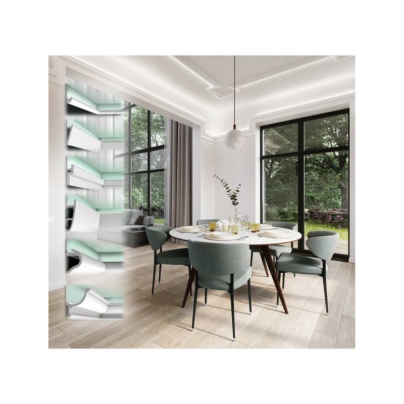 Die Stuckleisten sind aus hochdichtem DUROPOLYMER oder PUROTOUCH gefertigt und lassen sich einfach an Wand und/oder Decke kleben. Ausgestattet mit unseren LED-Sets entsteht so eine hochwertige indirekte Beleuchtung.