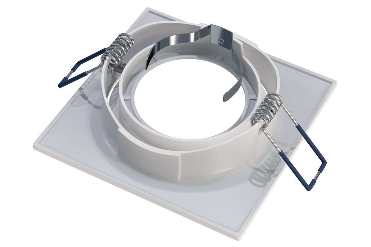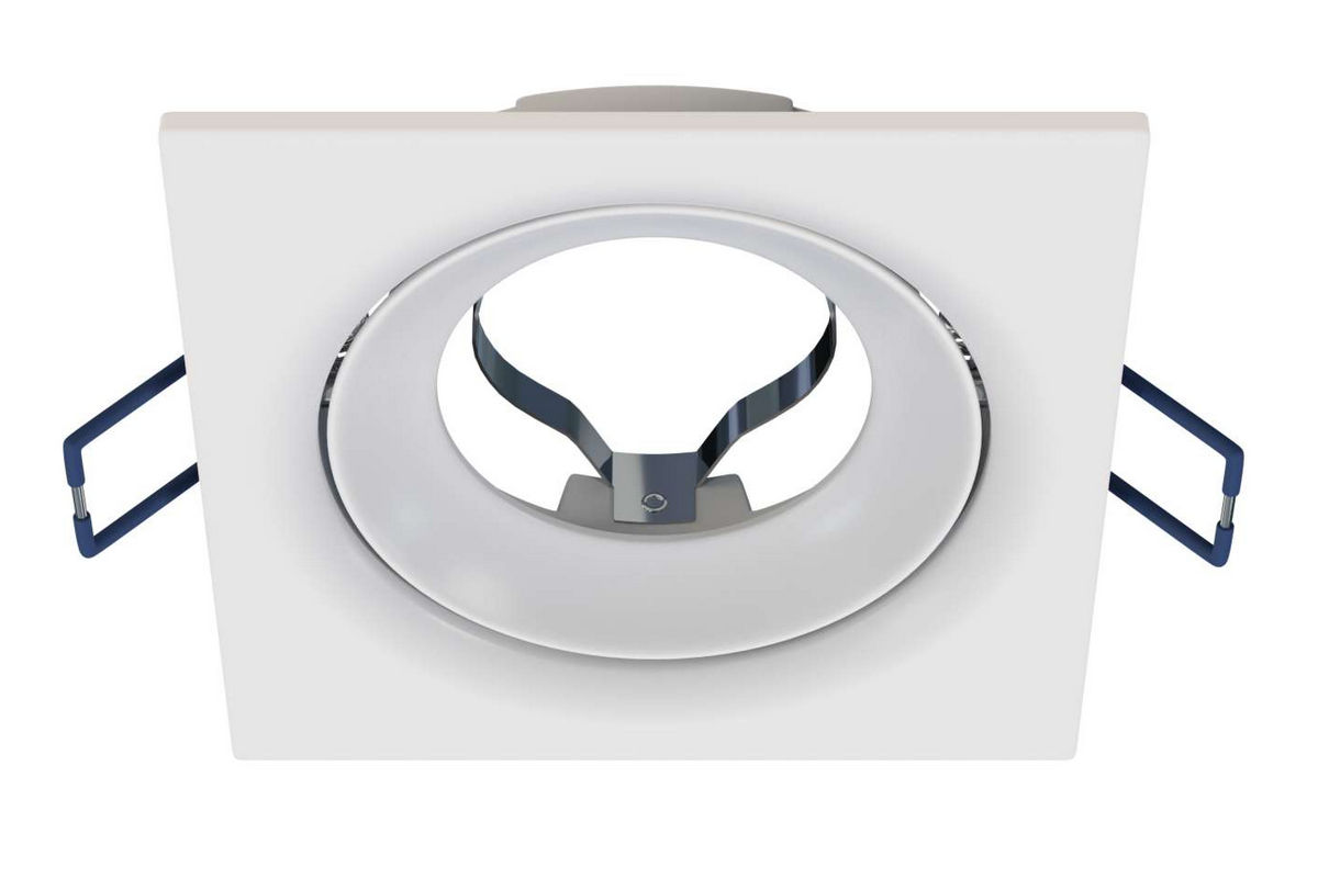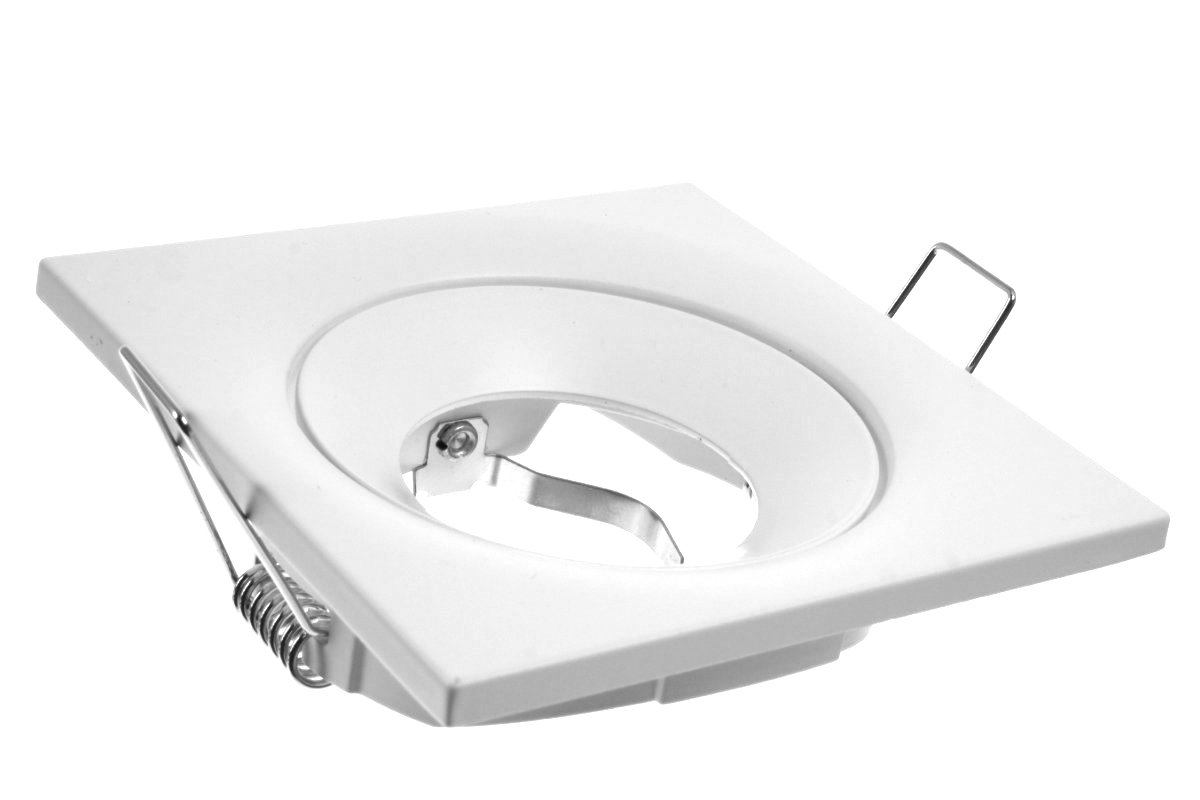 Das quadratische Einbaugehäuse für MR16-Spots ist aus Alu Druckguss gefertigt und weiß matt pulverbeschichtet. Von hinten werden typische MR16 Spots - z.B. GU10 mit 230VAC oder G5.3 mit 12VDC - mit einem Federring gehalten