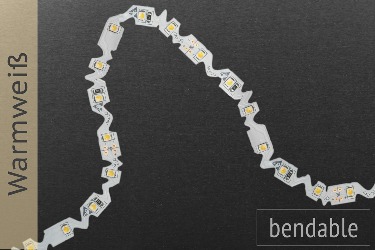 Dieser hoch-flexible LED-Streifen lässt sich in alle Richtungen biegen, horizontal und vertikal. Die eingearbeiteten Knick-Elemente erlauben ein sehr freies Verlegen in alle Richtungen, so dass sie den LED-Streifen ohne Lötaufwand an beliebigen Konturen entlang führen können und z.B. auch einen Kreis bilden können.