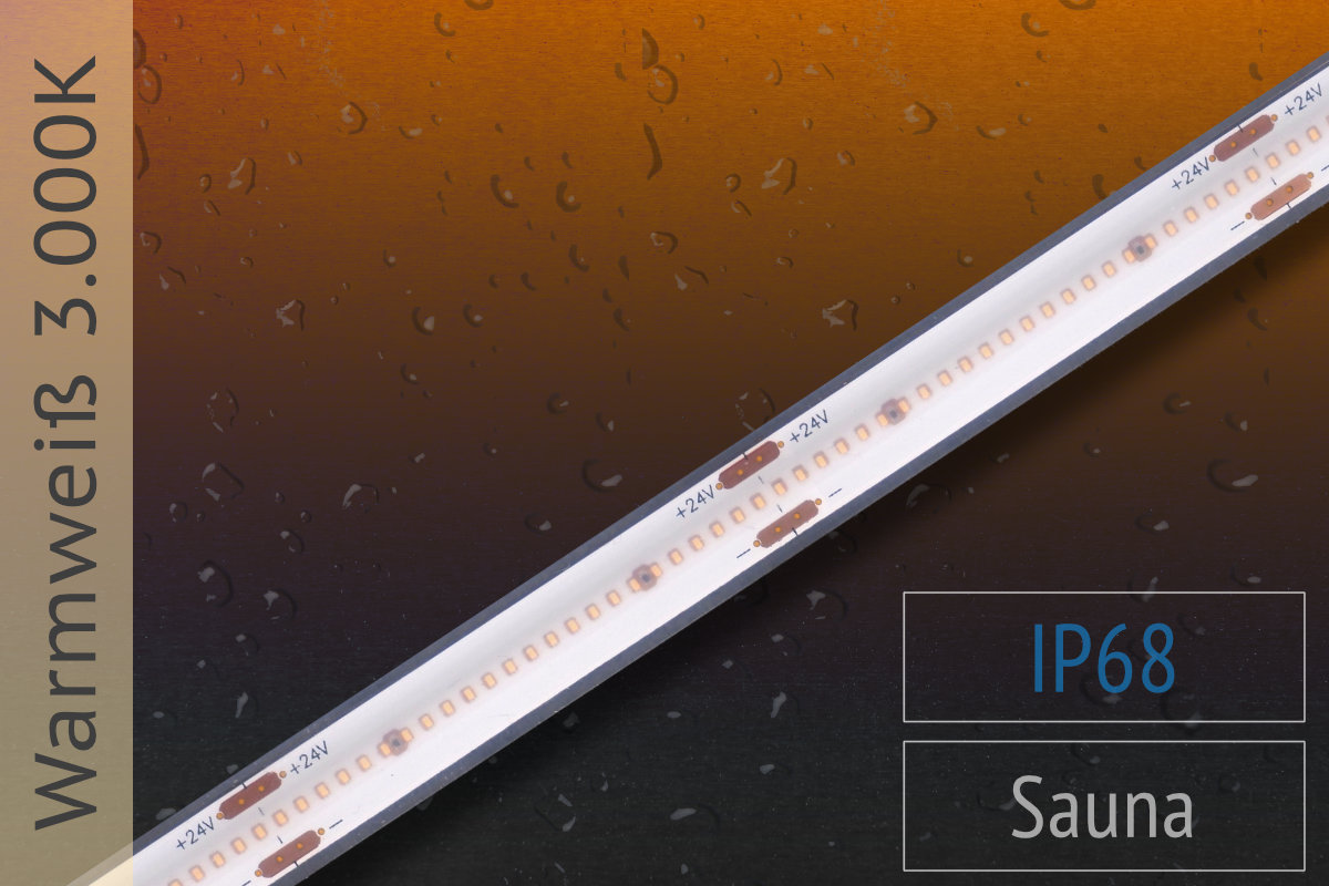 LED-Band für besonders hohe Umgebungstemperaturen, z.B. in Saunen. Während normale LED-Bänder für eine lange Lebensdauer nicht über 45°C eingesetzt werden sollten, ist dieses spezielle Band bis +90°C einsetzbar.