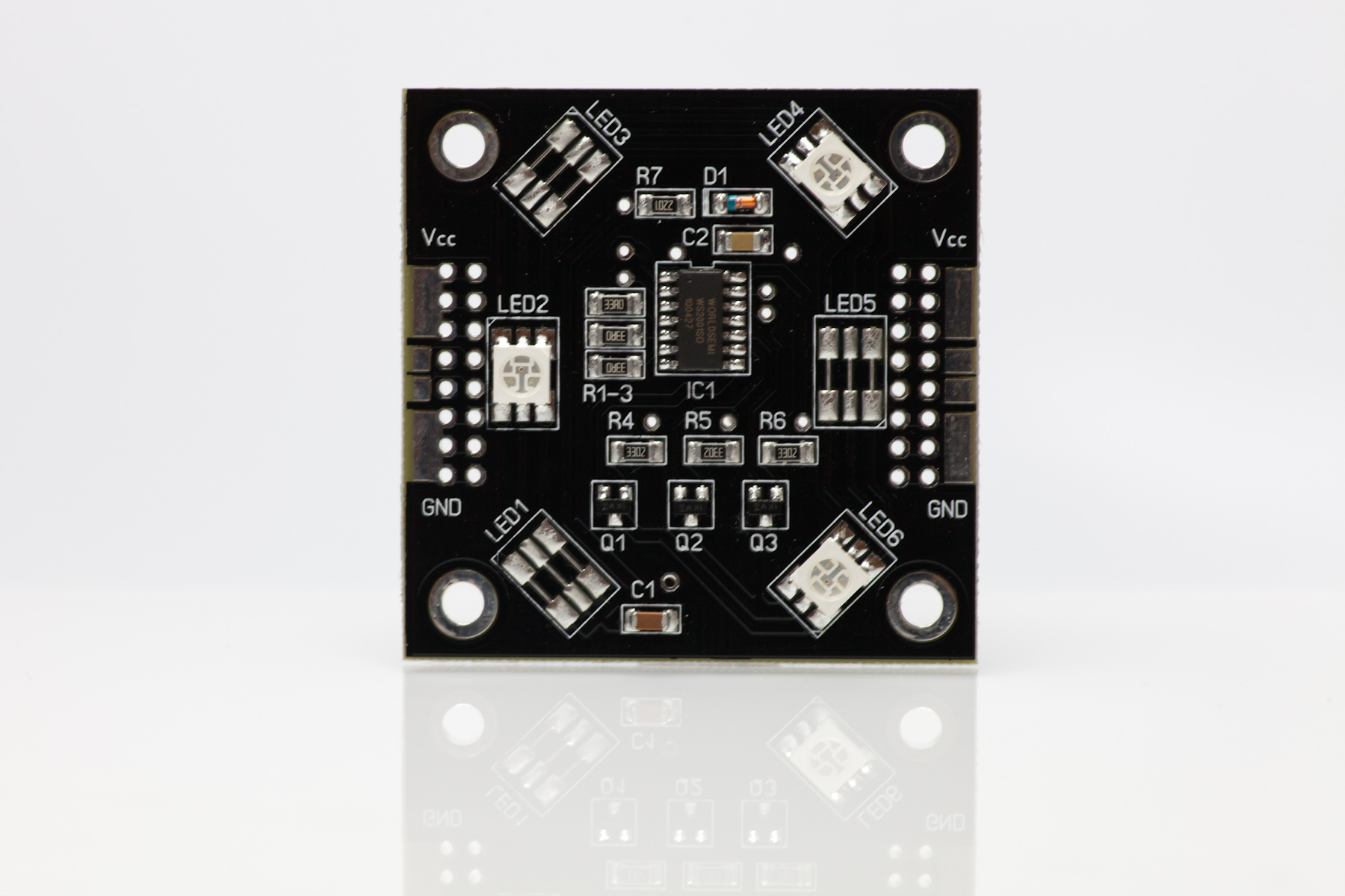 Die Pixel-Platine dient zum Aufbau von RGB-Pixel-Anordnungen in beliebiger Form. Das Maß von 50x50mm sorgt dabei für eine flexible Anordnungsmöglichkeit der Pixel. Egal ob linear, in Matrix-Ordnung oder individuell z.B. als Buchstaben. Diese Platine bietet viele Möglichkeiten.