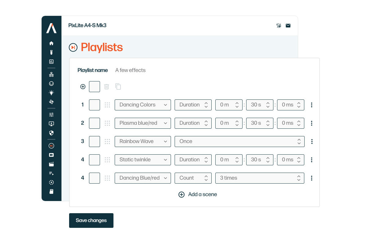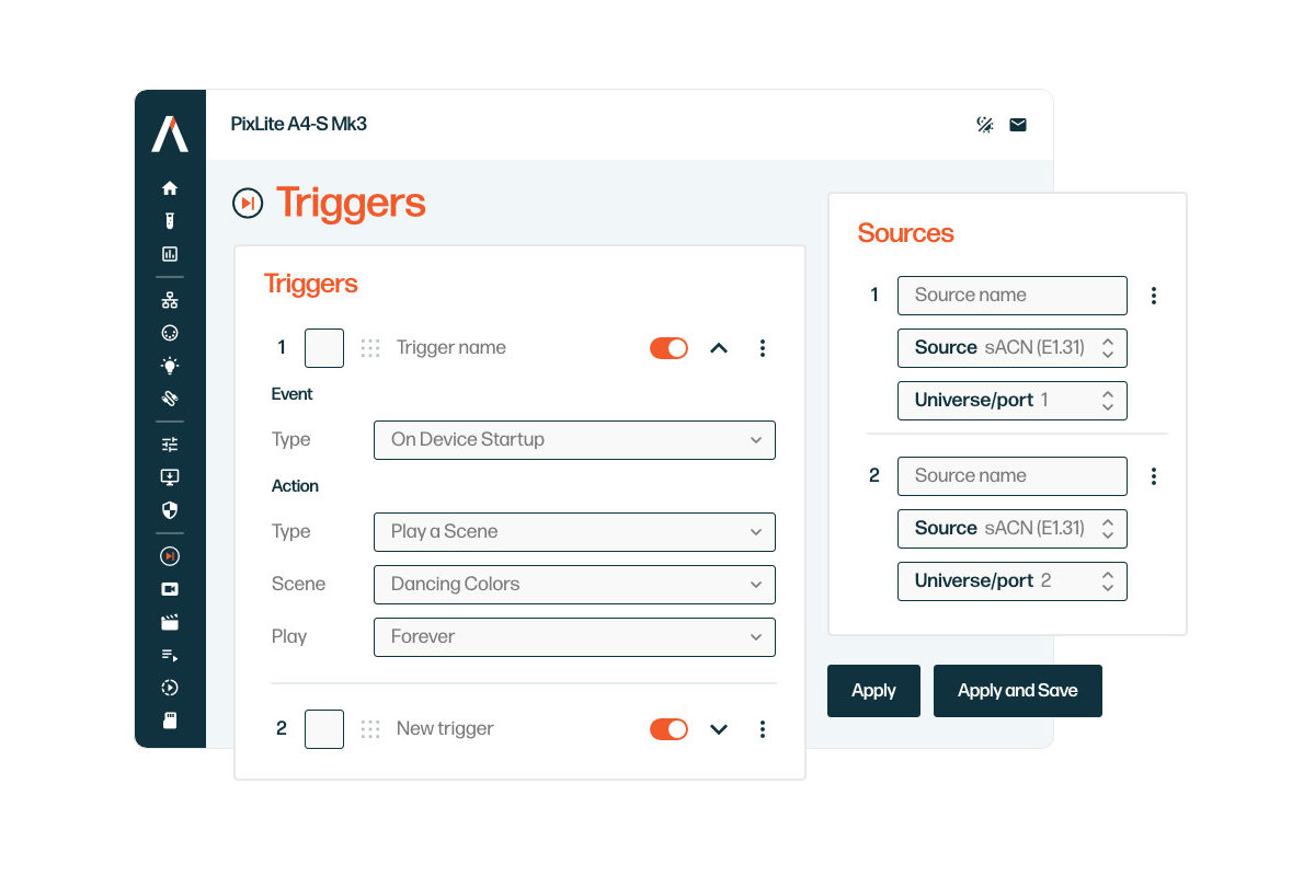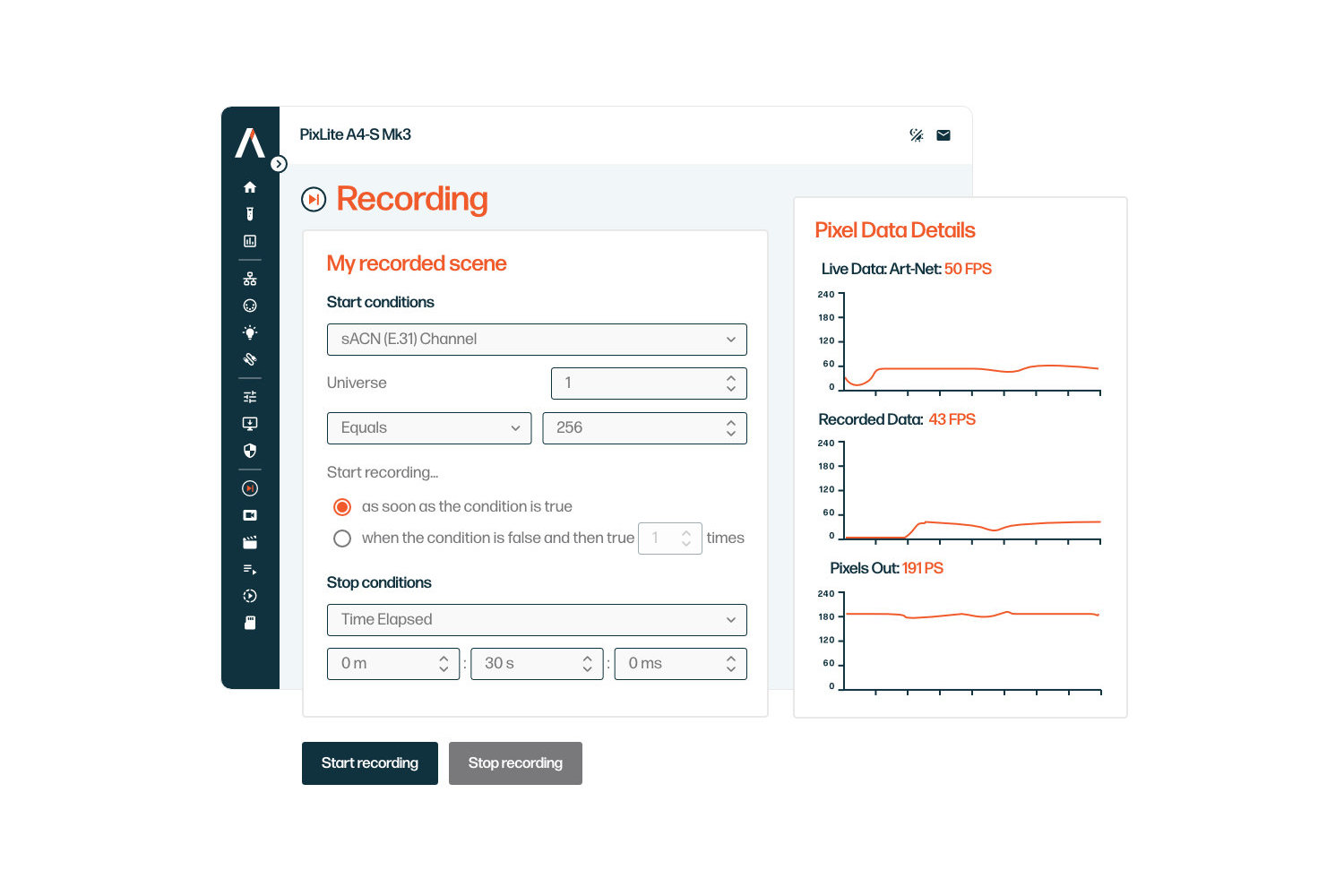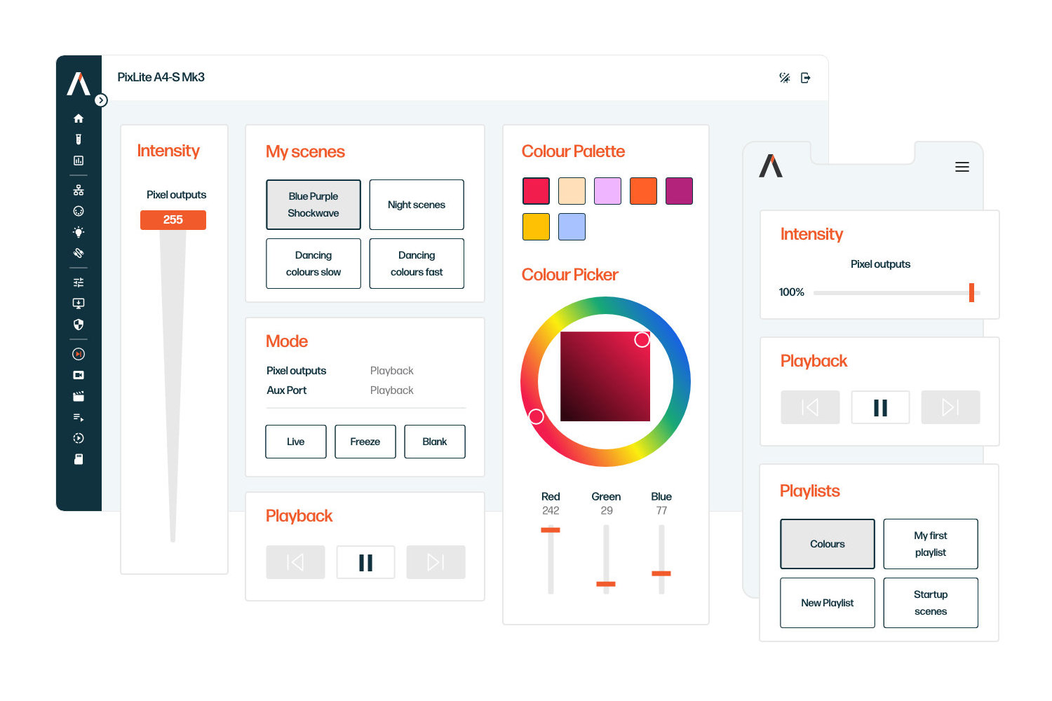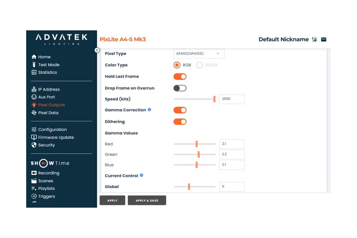 ADVATEK PixLite Controller benötigen keinen externen Player, denn dieser ist bereits integriert. Animationen können flexibel auf einer SD-Karte aufgezeichnet und abgerufen werden. Bis zu 25 Trigger via ArtNet oder UDP lassen sich zum Start / Stop der Animationen setzen. Das alles komfortabel steuerbar über die spezielle SHOWTime-App. Über Color-Picker und RGB-Fader ist auch eine einfache Direkt-Steuerung der Pixel möglich.