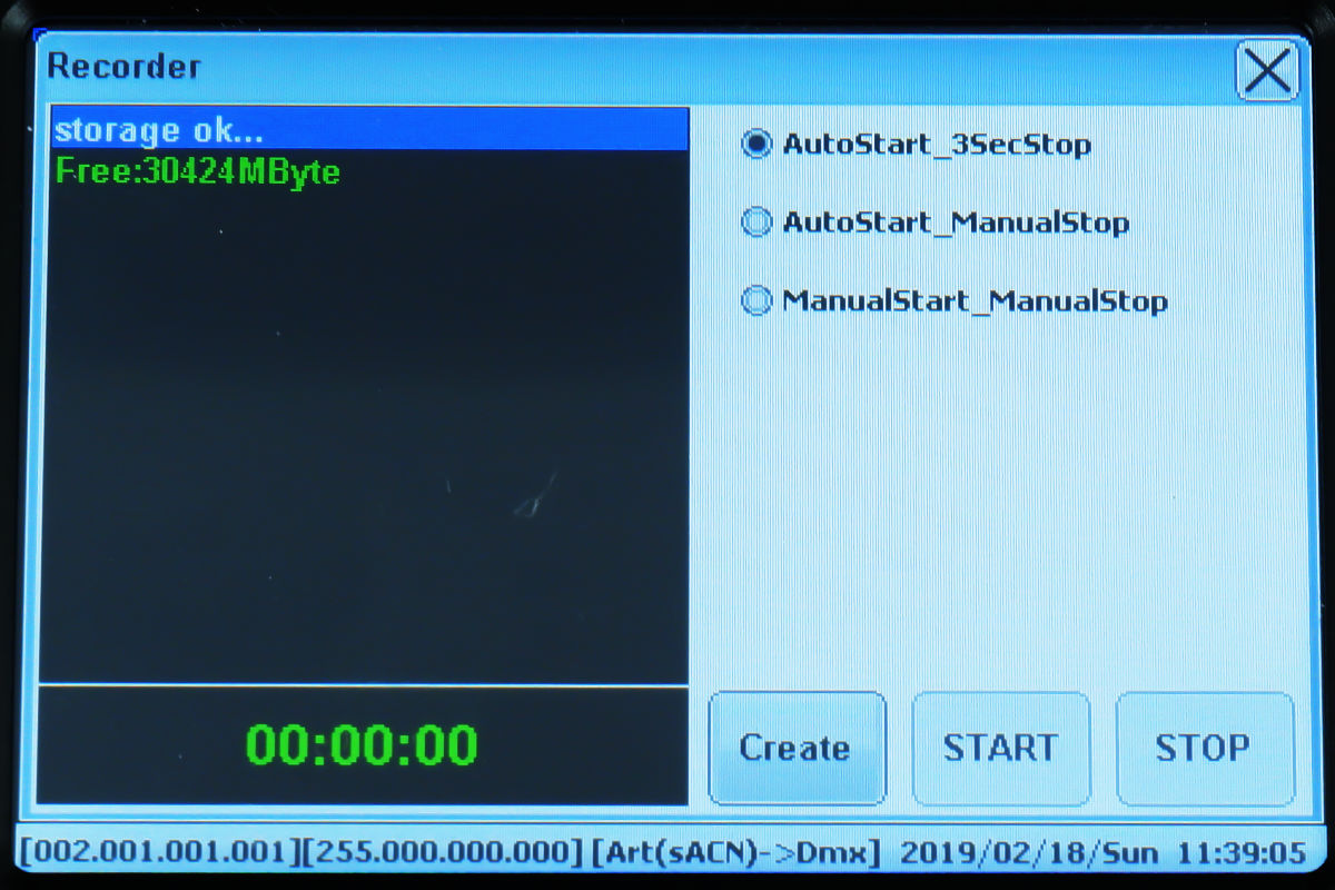 Die Recorder-Funktion ermöglicht die Aufzeichnung von Animationen, wie z.B. Farbsequenzen, von einer unterstützten PC-Software oder DMX-Konsole programmiert und via Art-Net™ abgespielt werden. Die Animationen werden dabei auf einer SD-Karte gespeichert und sind so auch austauschbar.