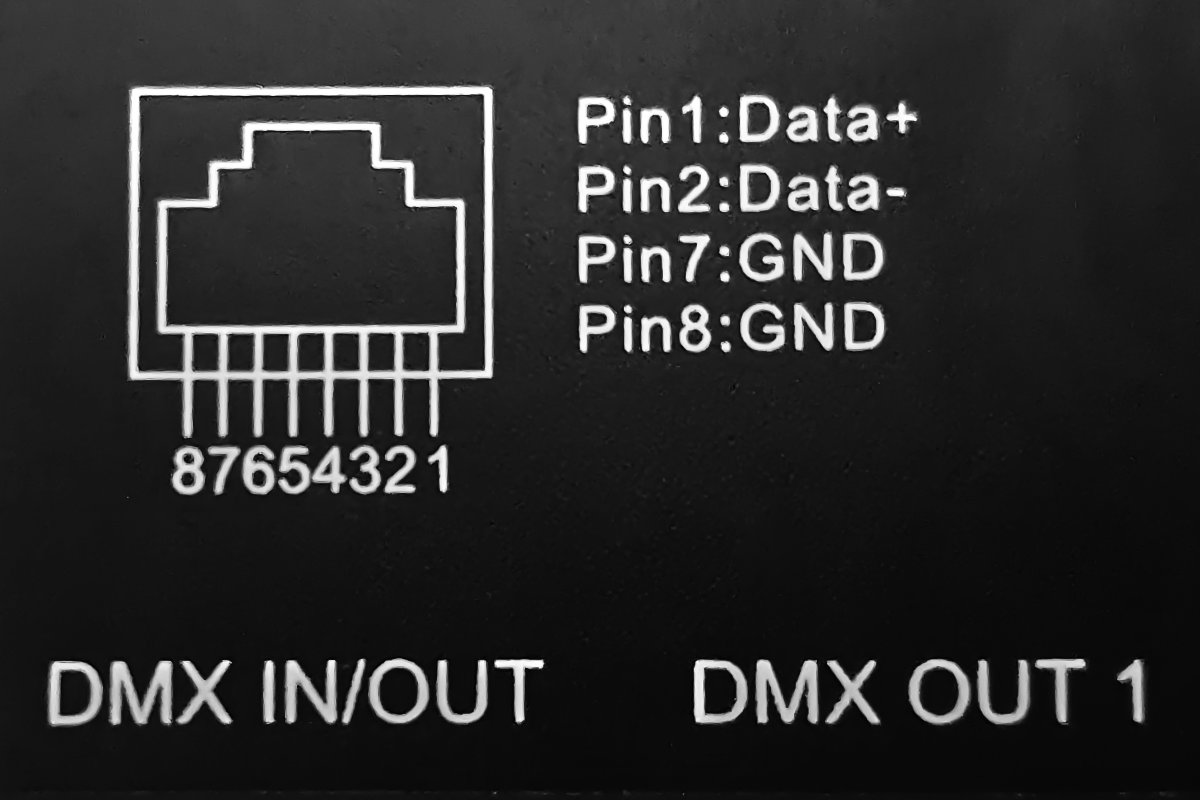 Weiterhin ist er auch als DMX-Splitter einsetzbar, indem der erste RJ45 DMX-Port als Eingang (DMX-IN) fungiert und das DMX-Signal auf 3 übrigen RJ45 DMX Ports verteilt (DMX-OUT 1-3).