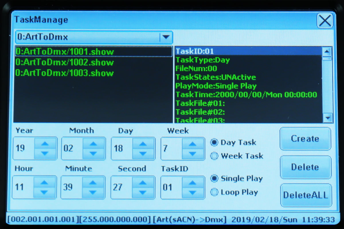 Die TaskManage-Funktion erlaubt es, bis zu 10 zeitgesteuerte Aufgaben zu erstellen, die dann vorher ausgewählte Animationen abspielen. Für jede geplante Aufgabe können Sie bis zu 10 aufgezeichnete Animationen auswählen. Der Wiedergabemodus kann SinglePlay oder LoopPlay sein.