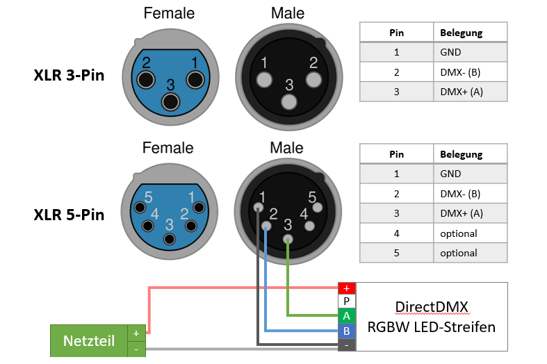Diese digitalen LED-Streifen lassen sich direkt per DMX steuern. Es ist kein separater DMX-SPI-Konverter oder Decoder notwendig, sondern es kann direkt über das mitgelieferte 5-pol XLR-Kabel ein DMX-Signal in den Streifen eingespeist werden. Der Streifen ist dabei flexibel programmierbar, sodass die Startadresse anpassbar ist. Ebenso können beliebig viele Pixel gruppiert sowie das Verhalten bei Verlust des DMX-Signals (Freeze oder vor eingestellte Farbe bzw. aus) konfiguriert werden.