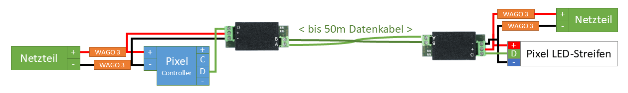 Beim Anschluss und bei der Verlängerung digitaler LED-Streifen sind gewöhnlich keine lange Kabelwege realisierbar (max. 2m). Das hochfrequente Steuersignal für die LED-Pixel wird schnell verfälscht und es kommt zu Fehlern in der LED-Animation.