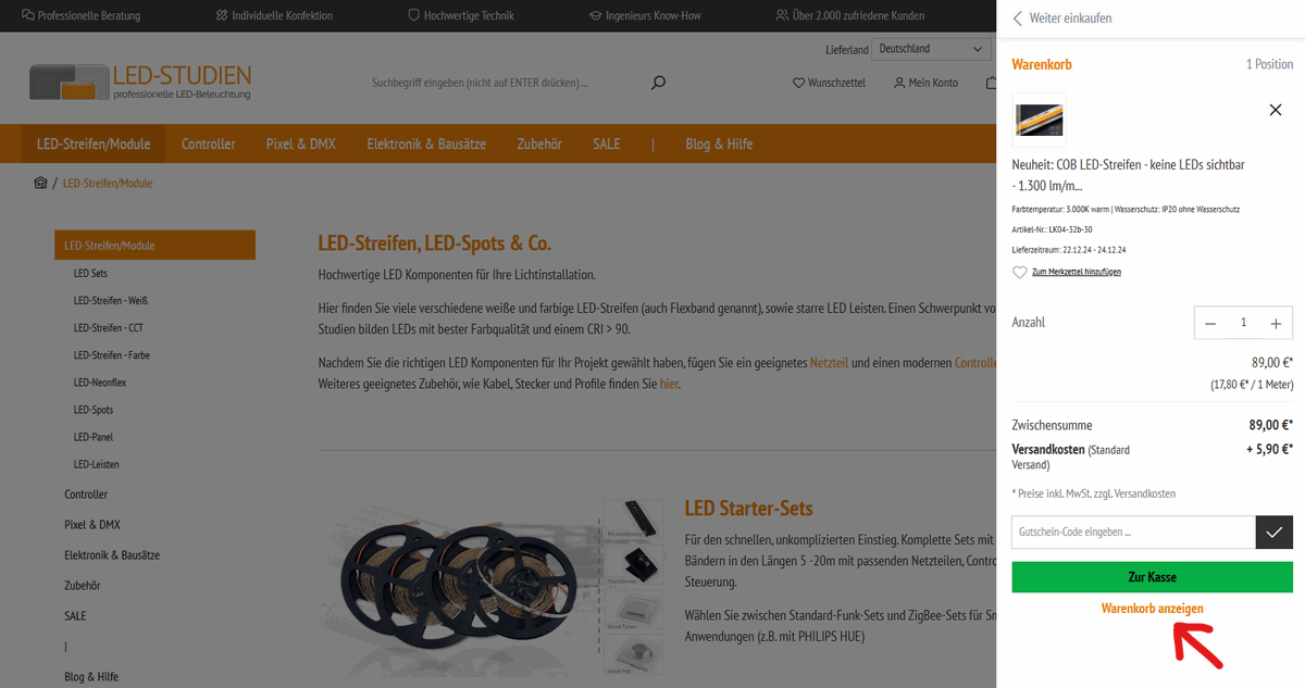Falls Sie den Warenkorb nur als schmale Seitenleiste sehen, wechseln Sie über "Warenkorb anzeigen" zuerst in die große Warenkorb-Ansicht: